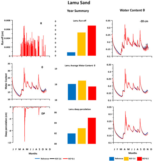 (2) Future climate change scenarios RCPs 2.6 and 8.5 simulations, which predict an increase in temperature and precipitation (Figure 3, Table 4) [41,79,80], recorded an average high deep percolation and runoff than the reference period. According to the results (Table 4), the average deep percolation is expected to increase by 14% for the RCP 2.6 scenario and by 10% for the RCP 8.5, with the clay, clay loam, sandy clay loam and sandy soils (of Lamu) expected to increase by 29, 23, 3 and 1%, respectively, for the RCP 2.6, and 29, 6, 2 and 4% for the RCP 8.5 scenario. The average runoff is expected to increase by 188% for the RCP 2.6 scenario and by 284% for the RCP 8.5, with the clay, clay loam, sandy clay loam and sandy soils (of Lamu) expected to increase by 13, 5, 159 and 575% respectively for the RCP 2.6, and 20,14, 327 and 775% for the 8.5 scenario. The average soil water content is expected to increase by 1% in the RCP 2.6 scenario and decrease by 2% in the RCP 8.5 scenario. For the different soils, the water content is expected to increase by 1% for clay, sandy clay loam and sand while no change is expected for clay loam soils in the RCP 2.6 scenario. On the other hand, the water content is expected to reduce by 2, 5 and 1% for clay, clay loam and sandy clay loam, with no change expected for sandy soils in the RCP 8.5 scenario.
