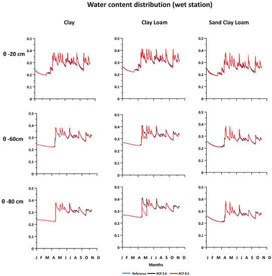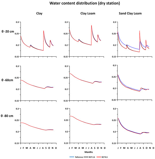 Generally, the water content for the dry stations at 20 cm depth for all soil types fluctuated throughout the year correlating with the amount of rainfall received in the different areas. The highest water content was recorded in September during second rainy season of the year in all soil types for the reference period and climate scenarios. For the clay and clay loam soils, there was no remarkable difference in soil water content between the reference period and the RCP scenarios. The largest impact on sandy clay loam at this depth was noted in both climate change scenarios, with soil water content increasing from 22 to 27% for RCPs 2.6 and 8.5 scenarios, respectively. However, at depths of 60 and 80 cm, the water content reduced at a steady rate throughout the year up until September where it increased slightly and reduced again around November. The average water content for all soil types at 20, 60 and 80 cm depths, respectively, for all soil types was found to be 20% (Figure 8 and Figure 9).