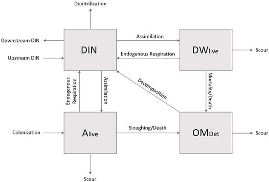 Detrital organic matter (OMDet) receives inputs from the live organic matter pool and is balanced by regeneration of inorganic N to the DIN pool, and scour and subsequent downstream transport.