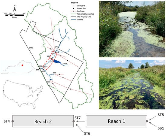 Agricultural watersheds with karst terrain are highly vulnerable to nutrient leaching, and have been a significant source of dissolved inorganic nitrogen (DIN) loads to regional waterbodies such as the Gulf of Mexico and Chesapeake Bay [1,2,3,4,5]. Small tributaries streams in these landscapes are important given they have high capacity to remove nitrate efficiently because of their high ratios of streambed area to water volume and can account for much of the stream length within a drainage network [6,7,8]. Much work in recent years has focused on the impact of hyporheic connectivity to impact in-stream N removal (e.g., [9,10]). Surface headwater streams in karst agroecosystems are often bedrock controlled and lack prominent hyporheic interaction, which would tend to suggest limited potential for DIN attenuation and transformation [11]. However, surface waters immediately downstream of surface-groundwater interfaces (e.g., springs) in karst landscapes have been identified as hotspots for biogeochemical transformations [12]. In-stream aquatic vegetation such as benthic algae and floating aquatic macrophytes can flourish in these environments and influence transient storage and transformation of nutrients, yet their impact on the stream N budget remains poorly constrained [11,13,14].