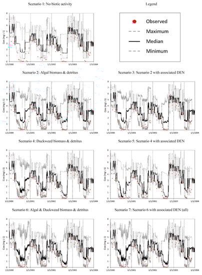 Results of the sensitivity analysis highlight that inclusion of both vegetation pools and their associated denitrification terms are important in order to capture the temporal variability observed in the four-year dataset (Figure 3). In scenario 1, the minimum-maximum range for DIN concentrations (CDIN) constrains the datapoints for winter months reasonably well with datapoints typically falling between the minimum and median lines. Deviation between measured and modeled values occur in the spring through the fall and are particularly high in the summer with minimum values over-predicting the measured data by as much as 1.66 mgN L−1 (11/8/2000) in the fall. These findings highlight the assumption that an inert conduit is inappropriate for the specified stream reach. Sensitivity analysis of the algae, its detrital organic matter, and associated microbial denitrification show improved capabilities to predict concentrations, particularly in spring and summer, but some limitations in fall (Scenarios 2–3). Minimum CDIN in Scenario 2 were able to bound much of the measured concentrations of DIN during the spring and summer season except for some periods in the fall (see fall of 2000), although median values still vastly over-predicted the data in the growing season. Comparing results of Scenario 3 and Scenario 2 illustrate the effects of denitrification associated with algae and its detritus are subtle and mainly only impact the magnitude of diel fluctuations in CDIN (see the maximum lines during the growing season). Sensitivity analysis for duckweed, its detrital organic matter, and associated denitrification also show the ability to capture the low CDIN observed during the growing season with some improved predictive capabilities over algae, especially in the fall (Scenarios 4–5). Minimum CDIN values in Scenario 4 was able to capture much of the variability in the dataset, and when including denitrification (Scenario 5) median concentrations were also able to capture much of the variability, suggesting that CDIN is highly sensitive to denitrification in the duckweed biomass pool. Comparing Scenario 5 and Scenario 3, we found that duckweed showed improved capacity to capture fall DIN concentrations compared with algae scenarios. Results for both duckweed and algae (Scenario 6) and their associated denitrification (Scenarios 7) more closely reflect the duckweed scenarios, although diel fluctuations were altered because algae was able to offset some of the N regenerated by duckweed (see difference in maximum lines from Scenario 4 and 6). Cumulatively these results suggest that both algae and duckweed may describe dynamics reasonably well, but the CDIN response variable is more sensitive to denitrification associated with duckweed than it is with algae and detrital organic matter.