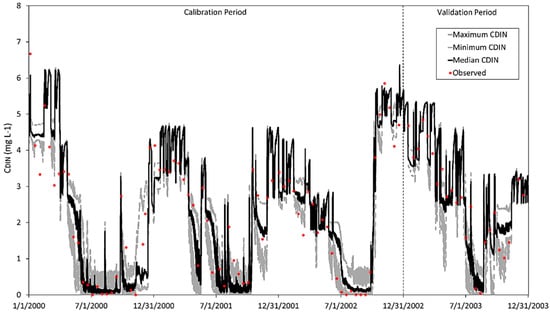 Maximum, minimum, and median CDIN for the calibration and validation periods with observed data points for comparison of model fit.
