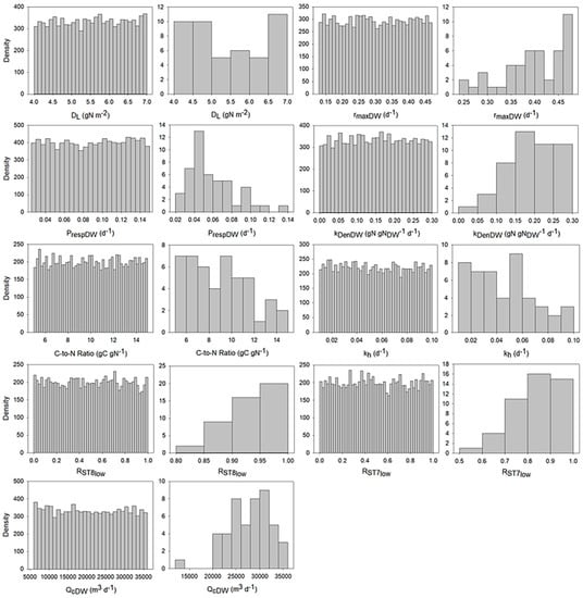 Histograms for each of these statistically significant parameters are shown in Figure 5. Duckweed limit density, DL, shows a skew to the lower and higher ends of the parameter range with a median of 5.40 gN m−2. The respiration rate for duckweed biomass, PrespDW, shows the majority of acceptable values around the lower third of the parameter range with a median value of 0.05 d−1. The maximum intrinsic growth rate for duckweed, rmaxDW, trends towards the upper end of the range with roughly 23 percent of the values falling in the uppermost end of the parameter range with a median value of 0.40 d−1. The denitrification coefficient for duckweed, kDenDW, trends heavily towards the upper end of the range with roughly 75 percent of the values falling in the upper half of the range (median of 0.19 gN gNdw−1 d−1), highlighting the potential for denitrification in the duckweed mats to exert a strong influence on N dynamics in the system. The carbon to nitrogen ratio trends towards the lower end, with a median of 8.99 gC gN−1, higher than the value of 5.56 gC gN−1 used in Chapra et al. [49]. The decomposition/hydrolysis rate of organic matter, kh, also trends towards the lower end with a median of 0.04 d−1, indicative of the sensitivity of regenerated DIN on the overall stream DIN concentration. The posterior spaces of both RST7low and RST8low only gave acceptable model solutions for the upper 80th and 50th percentiles of the prior parameter spaces, respectively, emphasizing the impact of main-stem DIN concentrations inputs on overall N dynamics in the study reach. The critical discharge threshold for duckweed, QcDW, skewed towards the upper half of the parameter range with a median of 28,370 m3 d−1, indicating the potential for duckweed mats to survive higher flow conditions.