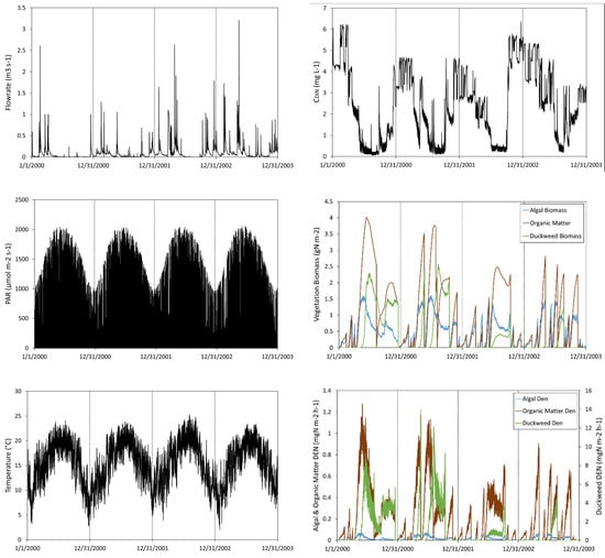 Flowrate, photosynthetically available radiation (PAR), and temperature modeling inputs over the four-year span 2000–2003 (left column). Modeled CDIN concentration, vegetation pool biomass (algae, dead organic matter, and duckweed) and modeled denitrification rates for each pool (algae, dead organic matter, and duckweed) over the four-year span 2000–2003 (right column).