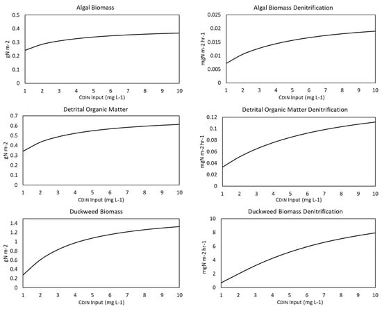 Further, while the modeling structure presented here offers a parsimonious representation of DIN, which is applicable to our system due to low levels of total ammoniacal nitrogen (TAN) year-round, explicit modeling of TAN and nitrate could be an important consideration elsewhere. While both TAN and nitrate are biologically available, aquatic vegetation has been shown to prefer uptake of ammonium when both species are abundant [83]. In a duckweed pond N transformation model, Peng et al. [30] considers ammoniacal-N and nitrate separately, and has different half-saturation coefficients for the uptake of each individual N pool. Surface streams with high organic runoff from pastures or point source contributions of wastewater would benefit from explicit consideration of each N form, which could aid in more appropriate estimates of biomass growth, overall N removal, and more realistic loading estimates. This could be of particular importance when determining management strategies for consistent inputs or estimating the effects of accidental overflow or wastewater system failure.