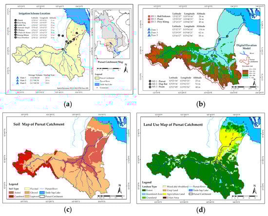 (a) Study area with dam and irrigation scheme location, (b) digital elevation model with hydrological and meteorological station, (c) soil type, (d) land use/land cover of PRB.