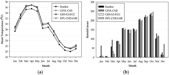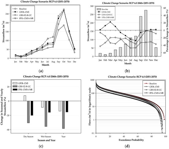 The future flow changes were analyzed through the change in meteorological data as projected by three GCMs under RCP 6.0. Modeling simulations indicated that the impacts magnitude of climate change on river flow varied considerably depend on seasonal climate. The projected hydrographs and percentage changes in the monthly flow illustrated a clear trend in changes (Figure 7a,b). Dry season flow will decrease for GISS-E2-R-CC and IPSL-CM5A-MR, with the exceptions for GFDL-CM3 (Figure 7b). The significant rising flows was 22% in March for GFDL-CM3. The highest magnitude flow reduction was –43% in January for GISS-E2-R-CC and −36% in April for IPSL-CM5A-MR. Similarly, wet season flow will reduce for all GCMs. The highest magnitude of flow reduction was –47% for GISS-E2-R in July, and –27% and –36% in August for GFDL-CM3 and IPSL-CM5A, respectively (Figure 7b).