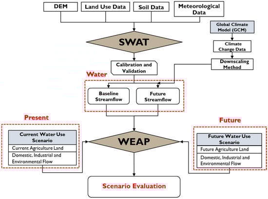 Model flowchart that illustrates the integration of the Soil and Water Assessment Tool (SWAT) and Water Evaluation and Planning (WEAP) models.