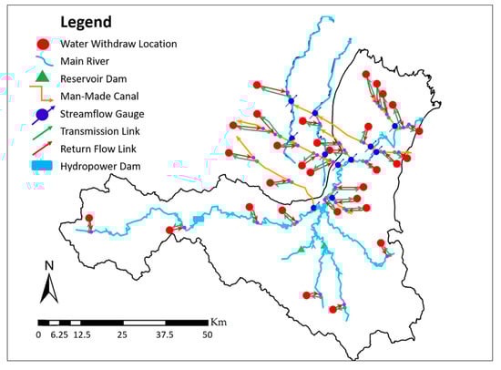 Water resources have been increasingly stressed due to the growth of multiple pressures, such as climate change, population growth, groundwater depletion, energy demand rise, and environmental flow requirements [1,2]. The Intergovernmental Panel on Climate Change (IPCC) has recognized the significant indications of climate change: global temperature rise due to greenhouse emissions and water cycle changes [3]. IPCC uses general circulation models (GCMs) for future climate change projections based on different representative concentration pathways (RCPs) scenarios. GCM projections indicate a strong variability of future precipitation and temperatures in terms of trends and extremes [4]. The change in the water cycle and hydrological regime would result from land use/cover change and climate change. Regarding future water management and hydrological processes under climate change conditions, water availability for meeting water supply diversion, reservoir storage, and environmental flow requirements must be assessed [5]. River flow maintenance is essentially needed for sustaining biodiversity in a river’s ecosystem. Water demand increases generally result unsustainable water use and insufficient water remain for environmental conservation [6]. In order to alleviate the water shortage problem, management options have been introduced as a key suggestion for water resources management. Management options could be considered both demand (reduce water demand) and supply (increase water to fulfill the demand) management options.
