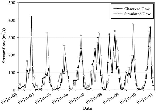 Data required by SWAT model to simulate monthly discharge consisting of Digital Elevation Model (DEM), land use, soil, and meteorological data. Sub-basins were delineated by using DEM with 30m-resolution obtained from ASTER Global DEM Version 2 released by the Ministry of Economy, Trade, and Industry (METI), Tokyo, Japan and the United States National Aeronautics and Space Administration (NASA), Washington, D.C., United States. Land use and soil data with 250 m-resolution (2002) were provided by MRC. The daily meteorological and flow data from 2002 to 2011 were acquired from Department of Hydrology and River Work of Ministry of Water Resources and Meteorology of Cambodia (MOWRAM). As shown in Table 3, there is a good agreement between observed and simulated flows based on criteria of three statistical indicators (NSN, PBIAS, and RSR). Additional data consisting of the water extraction locations, water demand sites and orders of water linkage, and water diversion and supply/demand were acquired from a field survey (Figure 4) [31]. Meteorological data from 1982 to 2010 consisted of maximum and minimum temperature, humidity, sunshine hours, and wind speed data with grid of 0.25° spatial resolution, and observed daily rainfall at three rainfall stations: Peam, Pursat, and Dap Bat over the PRB. The observed monthly streamflow at Bak Trakoun station were required by SWAT-CUP to make a calibration from 2003 to 2008 and a validation from 2009 to 2011 (Figure 5) [34].