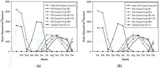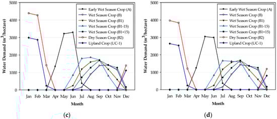 Irrigation water demand (IWD) for proposed cropping pattern of each crop variety were estimated based on the equation following by Japan International Cooperation Agency (JICA) (Equation (1)) [35]. The combination of proposed cropping patterns studied by JICA and MOWRAM [31] was used in this study (Table 4). Paddy rice, both rain-fed and irrigated, consisting of seven cropping patterns were selected as the major crop types. As recommended by the Food and Agriculture Organization (FAO) [36], the standard crop coefficients of each crop stage of paddy rice were used to calculate the crop water requirement. In addition, the values of Reference Evapotranspiration (ET0) for baseline and climate change scenario were calculated by Blaney-Criddle method [37] (Equation (2)) along with long-time meteorological data from 1982 to 2010. The effective rainfall was calculated using the formula proposed by JICA (Equation (3)). Irrigation areas for each cropping pattern, as well as a crop calendar for the Stung Pursat catchment are shown on Table 4. The unit of baseline and future irrigation water requirement of each crop type are shown in Figure 6.