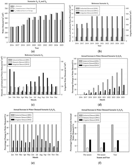 The irrigated areas were 39,387 ha in 2016 and projected to be 86,858 ha in 2025. The irrigation water demand (IWD) in S0, SI, and SII significantly increase from 2018 to 2019 since Kbal Hong and Damnak Ampil irrigation schemes were included in 2018 and 2019, respectively (Figure 8a). The irrigation demand (IWD) was the highest one, followed by the domestic demand (DWU) and the industrial demand (IDW) (Figure 8b). S0 found the highest IDW by 61.4 MCM in January and 52.4 MCM in September during dry and wet season, respectively. No significance of monthly variation of IDW and DWU was found (Figure 8c). In SI, the percentage increase of IDW, DWU, and IWD were from 8%, 1.4%, and 4.1% in 2017 to 100%, 13.5%, and 37.4% in 2025, respectively (Figure 8d).