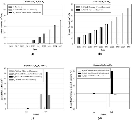 The unmet demand (UD) will gradually increase from 0.6 MCM in 2019 to 40.8 MCM in 2025 under SI. With reservoir, the significant UD will occur only from 2020 to 2021, and there will be no unmet demand from 2022 (Figure 9a). With E-flow, UD increased from 11.2 MCM in 2016 to 63.5 MCM in 2025 (Figure 9b). The total UD for industrial (IDUn), domestic (DWUn) and irrigation (IWUn) were highest in February under SE, followed by SI, SII, and SIE (Figure 9c). With the reservoir in SII, the significant UD decrease was −87% in February (Figure 9d). Under SI, the IWUn, DWUn and IDUn were 4.6 MCM, 860.4 CM, and 1262 CM, respectively, in February (Table 8). With E-flows in SE, the IWUn, DWUn, and IDUn were 14.6 MCM, 860.4 CM, and 1262 CM, respectively, in February (Table 9). With reservoir in SII and SIE, the IWUn, DWUn, and IDUn show a significant decrease during dry season, mainly in February (Table 8 and Table 9).
