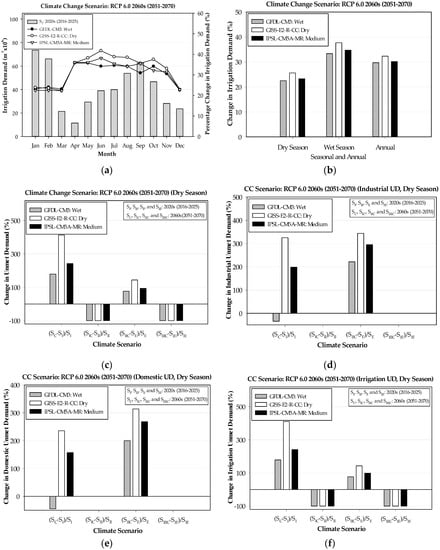 The potential effects of climate change refer to the alteration of future climate data (i.e., temperature and precipitation) which result in the change in hydrology (i.e., water supply) and irrigation water requirement (i.e., water demand). Figure 10a illustrated comparatively significant difference of projected IWD by the future period (2060s: 2051–2070), compared to the present (2020s: 2016–2025). The overall monthly increase was substantial greater than 20% for all GCMs under RCP 6.0. These results were in agreement with studies of multimodal projections of IWD under climate change [14]. The monthly IWD increases in the dry season ranging from 22% to 36 % for all climate change scenarios (Figure 10a). The most significant of dry season IWD increases was 36% for IPSL-CM5A-MR. Similarly, it will increase during wet season, ranging from 30% to 41% for all climate change scenarios and the highest magnitude of rising IDW was 35% for GFDL-CM3 in April and 41% in July for GISS-E2-R-CC and IPSL-CM5A-MR, respectively. The relative change between the projected seasonal IWD and the baseline seasonal IWD illustrated that the seasonal IWD will increase during both wet and dry seasons for all GCMs, in particular, for GISS-E2-R-CC (Figure 10b).