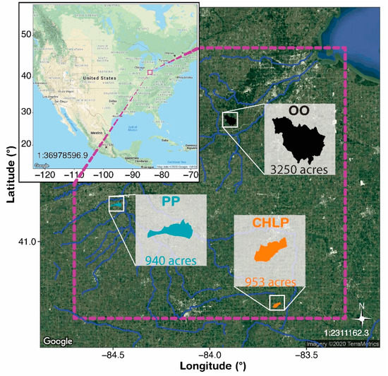 Map of the sampling locations used in the study. The study area was in northwest Ohio in the purple area highlighted on the map in the upper left corner (1:36978596.9 scale). Floodplain sediments were collected from benches formed in agricultural channels in the Oak Openings (OO), Paulding Plains (PP), and Clayey, High-Lime Till Plains (CHLP) Ecoregions as shown in the lower right map (1:2311162.3 scale). Watersheds were delineated using the US Geological Survey StreamStats (USGS) Geographic Information System (GIS) program and are shown for the sampling locations with the watershed area indicated.
