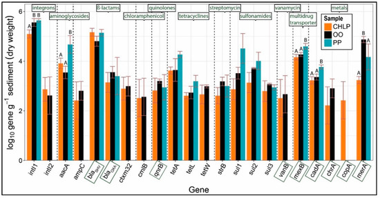 Contrary to antibiotics, a variety of metals were detected and quantified in our sediments (Table S4). Three of the four metal homeostasis genes detected by the Fluidigm had a corresponding metal concentration measured in this process: Cd (cadA), Cr (chrA), and Cu (copA) (Figure 6). While a greater abundance of cadA genes was detected in the PP sediments, the concentration of Cd in PP sediments was in between that of the CHLP and OO sediments. There was a greater concentration of Cr in the PP sediments, yet chrA was below detection. On the other hand, the CHLP had a greater concentration of Cu and was the only site where copA was also detected—but that occurred in only one of the three replicates. While significant differences in the quantities of merA genes had been noted, our methods did not allow for the detection of Hg in the sediments. In addition to these metals, a number of potentially toxic metals were quantified and corresponded with genes that had been detected in the GeoChip (Table S3), including Ni, Zn, As, Ag, Co, Pb, and Tl (Table S4).