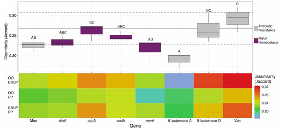 Diversity of antibiotic resistance and metal homeostasis genes between the sediments. Along the top are the box plot representing the three scores with letters indicating significant levels of difference between genes using the Tukey HSD test. The solid, horizontal line represents the average dissimilarity across the whole GeoChip bounded by the 95% confidence interval (dashed lines). The heatmap along the bottom illustrates the dissimilarity score calculated for each of the three sediment pairs (OO-CHLP, OO-PP, and PP-CHLP). Note: few qnr genes were detected by the GeoChip (only four across all sites); therefore, these genes were not included in the diversity analysis shown below (see Figure S1 in Supplementary Materials for additional details).