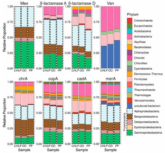 Each GeoChip is designed to detect a single gene-variant that arises from unique species providing the phylogenetic-lineage for each gene. Generally, the majority of probes detected for the antibiotic resistance and metal homeostasis genes were derived from Proteobacteria (Figure 4). In fact, >98% of all Mex genes—efflux-mediated resistance genes in the RND-superfamily of transporters—were derived from the Gram-negative Proteobacteria. This dominance of Proteobacteria was expected as RND transport systems span the inner and outer cell membranes of Gram-negative organisms [47]. Likewise, the presence of Actinobacteria-related Van genes makes logical sense as vancomycin affects Gram-positive bacteria through interfering with peptidoglycan development. For the metal homeostasis genes, Proteobacteria accounted for between 48–64% of the communities, while other abundant phyla included the Actinobacteria, Firmicutes, and Bacteroidetes.