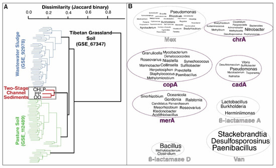 Antibiotic resistance and metal homeostasis gene probes were cross-detected in two-stage channels and other environments. (A) Hierarchal clustering analysis was used to compare different GeoChip sets based on the shared gene probes using the binary Jaccard index. Only one sample from a study of Tibetan restored grasslands is shown. (B) Indicator species analysis of antibiotic resistance and metal homeostasis gene probes for two-stage channel sediments with word area scaled according to the maximum number of these indicator gene probes associated with each genus and normalized to the number of probes for that particular gene (larger font = more gene probes).
