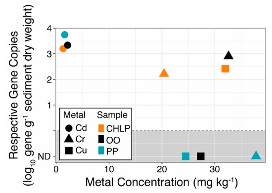 The concentrations of cadmium (Cd), chromium (Cr), and copper (Cu) in the three sediments compared to respective gene copies quantified by qPCR. Replicates were used to calculate the average metal concentration (n = 2) and gene abundances (n = 3). Note that mercury (Hg) was not quantified in this analysis. The dashed line represent 100 and undetected (ND) genes are shown below this line in the gray, shaded area.