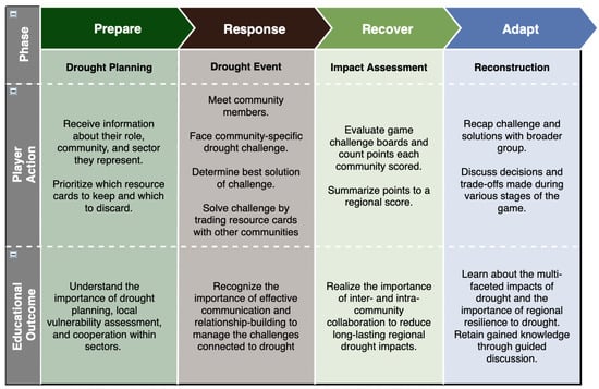 The Ready for Drought? game is an in-person role-playing game that can be played with 12 to 42 people. The game consists of four phases: (1) prepare, (2) response, (3) recover, and (4) adapt phase (Figure 1) during which the game package materials (Figure 2) are used.