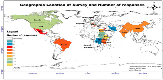 The questionnaire was prepared with a Likert scale of 1–5 representing the following for each indicator: 1. Not important, 2. Less important, 3. Neutral, 4. Moderately important, and 5. Very important. It was distributed via email to a total of 215 experts in Africa, Asia, Europe, North America, and South America, with 150 complete responses collected, following a snowball sampling method. The experts represented five professions: Hydrology/water resources, environmental science, law, socioeconomics, and political science. All experts had an educational background at the master’s level or above, and worked in universities, ministries, embassies, regional and international agencies and institutes, nongovernmental organizations, and independent consultants (Figure 2 and Figure 3).
