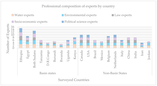 To differentiate potential partialities within, outside, and between countries, experts were also grouped as basin and non-basin professionals. To ensure fair representation of experts across all continents, when we planned three responses from each four professions in the nine basin countries due to the difficulty and time it takes to reach out the questionnaire to experts outside of Africa, two responses per five professions was targeted from at least two countries found in the remaining four continents excluding Antarctica and Australia. Accordingly, 135 and 80 experts were targeted from basin and non-basin countries, respectively. The quota of questionnaires among professions also targeted equality. Apart from basin countries, the choice of representative countries from the four continents were made based on their involvement in international water disputes. For example, from Europe, Belgium and the Netherlands were selected given their experience on the Meuse River. Similarly, the USA had negotiations with Canada and Mexico on the Colombia and Rio Grande Rivers, respectively. Additionally, from the Middle East and Asia, Jordan and Israel (Jordan River), Iran and Iraq (Tigris River), as well as China and India (Mekong River), were selected.
