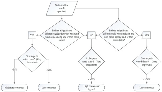- If there is a statistically significant difference either among basin countries or between basin and non-basin countries, and the percentage of experts selecting ‘very important’ is <50%, then the degree of consensus is considered low; and