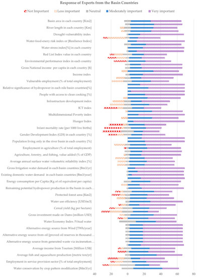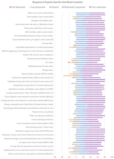 According to the summary of data (Figure 5 and Figure 6), the response from basin country experts covered all classes from not important to very important (1–5) for most of the indicators. For non-basin countries, this was not the case. This emphasizes that experts from basin countries appeared more divided on most of the indicators than non-basin experts. Yet, basin experts also expressed a common positive inclination for some indicators, including water-food-energy risk index, population without electricity, the relative significance of hydropower, access to drinking water, access to clean cooking, multidimensional poverty, hunger index, existing irrigation demand, and future domestic water demand. Contrarily, although approximately 80% of non-basin experts considered the majority of indicators to be important, there were some exceptions on which they were divided, including ICT index, life expectancy index, cereal yield, and industry (%GDP).