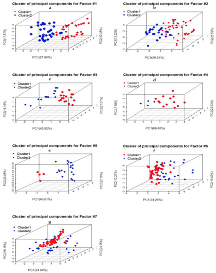 A cluster based on basin experts’ professions, in which black triangles are hydrologists, yellow rectangles are socioeconomics, purple crossed circles are environmentalists, red circles are political scientists, and blue diamonds are law experts, where (a) are experts response divisions on indicators under factor-#1—natural features, (b) factor-#2—socioeconomic needs of basin states, (c) factor-#3—the population dependent on the watercourse, (d) factor-#4—the effects of water use, (e)factor-#5—existing and potential uses, (f) factor-#6—costs of conservation & protection, and (g) factor-#7—availability of alternative and comparable values.