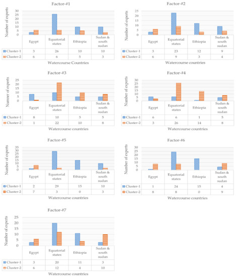 Beyond the confirmation of optimal number of clusters to be (k = 2), the number of experts falling into each distinct cluster based on hydrologic position is also insightful (Figure 8). Sudan and Egypt were visibly similar for indicators focused on factor 6 (costs of conservation and protection) and factor 7 (availability of alternative uses). However, for factors 1–5, most Sudanese experts’ responses more closely matched upstream expert opinions, leaving a relatively clear separation between Egypt versus other basin states. Although these conclusions can be drawn at the factor scale, broad dissimilarities across all indicators listed under each factor are not necessarily evident. Rather, it is typical only a few indicators under each factor that strongly influence the division by hydrologic position. These specific indicators can be identified through the proposed statistical tests.