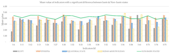 Comparing individual basin states with aggregated non-basin countries, for the 19 indicators (mean value), one or more basin states exhibited a statistically significant difference with non-basin countries (Figure 10), except for red list index value in each country (I-11). Predominantly, the non-basin experts’ opinions aligned with upstream states, especially with Ethiopia. The largest gap for most of the indicators was observed between Egypt and non-basin experts. Sudan experts’ opinions aligned closely with Egypt for indicators such as I-58 and I-74. However, for the remaining indicators, Sudan responses aligned more closely with upstream states, particularly with equatorial countries.
