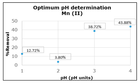 Synthetic wastewater of Mn (II) of a volume of 25 mL was prepared at a concentration of 100 mg·L−1, using a stock solution of 1000 mg·L−1 Mn (II). Subsequently, the pH of each solution was adjusted to 1, 2, 3 and 4 with HNO3 1 M (no higher pH was used, as, when alkalinizing, Mn (IV) precipitated). Then, 0.500 g of agricultural waste (CP) [29] was added and stirred for 1 h at 100 RPM with a magnetic stirrer at room temperature 18 °C. After some time, they were filtered into qualitative filter paper and the final concentration was determined by AAS with the supernatant. It is relevant to mention that this experimental procedure was performed three times for each pH.