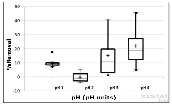 Figure 2 illustrates the different pHs vs. % removal and Figure 3 shows the Box plots obtained with the free XLSTAT software to report the data obtained from the different pHs from 1 to 4 units: