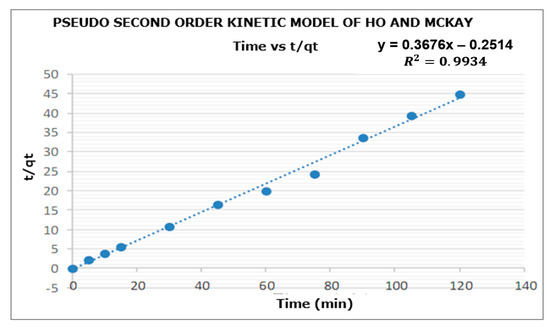 In the adsorption system, contact time plays a vital role, irrespective of the other experimental parameters that affect the adsorption kinetics. Synthetic wastewater of Mn (II) of a volume of 25 mL was prepared at a concentration of 100 mg·L−1, using a stock solution of 1000 mg·L−1 Mn (II), which was adjusted to the optimum pH of adsorption of the pollutant determined according to Section 2.4. Subsequently, 0.500 g of agricultural waste (CP) was added and placed in a magnetic stirrer at 100 RPM at different contact times (5, 10, 15, 30, 45, 60, 75, 90, 105, and 120 min). Subsequently, they were filtered on qualitative filter paper and the final concentration in the AAS was determined using the methodology described in Section 2.3. This experimental procedure was performed two times for each contact time.