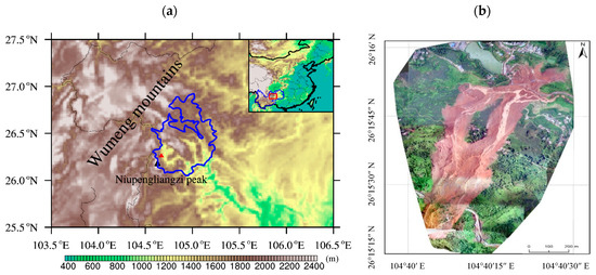 (a) The topographical distribution of the Wumeng Mountains and (b) an image of the Shuicheng County landslide and debris flow of 23 July 2019 after cessation, Source: Guizhou Earthquake Administration (http://www.gzsdzj.gov.cn/xygl/yjcz/201907/t20190726_5304724.html). The red solid triangle represents the location of the landslide; Shuicheng County is outlined in blue. In the inset map of panel (a), the Yunnan–Guizhou Plateau is outlined in blue, and the area of interest is outlined with a red box.