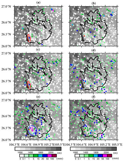 From 09:00 to 16:00 UTC on 22 July, a sudden rainstorm with a shorter duration occurred in the complex terrain of Shuicheng County; Figure 2 shows the hourly accumulated precipitation and topographic characteristics during the AHRE. The slope of the main peak is the transitional zone with a higher altitude gradient (e.g., red circle in Figure 2a), while the valley regions have relatively flat areas between the higher terrains (e.g., blue circle in Figure 2e). It can be seen that a 1 h rainfall amount ≥ 20 mm occurred from 09:00 to 10:00 UTC on 22 July, but only one station with a rainfall amount of 39.9 mm was located in the windward slope of the Niupengliangzi main peak (red circle area in Figure 2a). From 10:00 to 11:00 UTC, three stations located in the slope of the middle main peak of Shuicheng County had 1 h rainfall amounts of ≥20 mm. From 11:00 to 12:00 UTC, a west–east rainstorm belt was apparent in northern Shuicheng County at 26.6° N. In addition, there were three isolated stations in the southern part of the rainstorm belt: two stations in the slope of the Niupengliangzi main peak and another station in southeastern Shuicheng County that recorded rainfall in excess of 20 mm/h. Here, the station 5.4 km south of the landslide point had a 1 h rainfall amount of 25.4 mm and a 3 h rainfall amount of 65.3 mm from 09:00 to 11:00 UTC, which satisfied the conditions for an AHRE in the windward slope of the Niupengliangzi main peak (red circle area in Figure 2c). From 12:00 to 13:00 UTC, the blue-colored stations with 1 h rainfall amounts ≥ 20 mm increased rapidly and showed a northwest–southeast orientation band in the valley region between the major mountain ranges, such as two stations with 1 h rainfall amounts ≥ 20 mm 10 km north of the landslide point. From 13:00 to 14:00 UTC, the 1 h rainfall amount increased suddenly in the valley region, and four stations within the 8 km to the east of the landslide point recorded more than 50 mm of rain (blue circle area in Figure 2e), while there was no obvious heavy rainfall in the slope of the main peak (red circle area in Figure 2a). From 14:00 to 15:00 UTC, stations exceeding 20 mm decreased rapidly in the valley region, but, since stations had still previously recorded more than 50 mm of rain in the valley near the landslide location, the AHRE conditions were still satisfied. From the spatiotemporal distribution of the rainstorm, it can be seen that there were two rainfall stages in center Shuicheng County: an isolated rainfall in the slope of the main peak during the early stage (Figure 2a–c) and a stronger rainfall band located in the valley between the major mountain ranges during the later stage (Figure 2d–f).