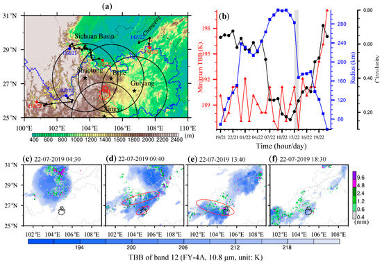 (a) The locations and propagations of mesoscale convective systems (MCSs) over Southwest China. The MCS centroids are denoted by solid circles with accompanying time labels (hour/day UTC); the blue spots represent onset locations, and the red spots represent dissipation locations. The locations of the four radars are denoted by solid stars; the radius of the range rings is 200 km. The Yunnan–Guizhou Plateau area is outlined with a blue line, and Shuicheng County is outlined with a red line. (b) The minimum blackbody brightness temperature (TBB), radius, and circularity evolution of the MCSs. The gray shaded area represents the moment the MCSs split. (c–f) The infrared images of TBB observed by the FY-4 satellite and overlaid by the future 10 min accumulated precipitation. The colored dots represent different levels of precipitation, and the red circles denote the rainfall bands.