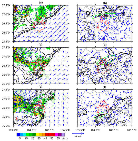 The MCSs may take on different types of organization in regions with different environmental conditions [31]. In this study, we describe the organization of the convective cloud clusters in the MCSs by combining the surface and midlevel environmental field conditions to evaluate the two heavy rainfall stages in Shuicheng County. To show the overall convective characteristics in the MCSs clearly, the convective cloud cluster in the satellite images and corresponding radar composite reflectivity under different environmental field conditions are shown in Figure 4. At 09:00 UTC, during the early rainfall stage, a banded convective cloud cluster with a northeast–southwest orientation was located on the northwest edge of Shuicheng County. At this point, the body of this MCS had not moved into Shuicheng County, and Shuicheng County was dominated by southwesterly winds with no obvious synoptic-weather system present (Figure 4a). However, southeasterly warm and moist air at the surface flowed into the “bellmouth” topography, which contributed to the topographic rainfall in Shuicheng County (Figure 4b). In addition, the obvious vertical shear environment of the horizontal winds over Shuicheng County from the surface to 700 hPa favored the formation of topographic convection [32]. At 12:00 UTC, before the later rainfall stage happened, convective cloud clusters in the MCSs had organized into a west–east oriented band that corresponded to an intense radar echo belt in the northwestern and northeastern areas of Shuicheng County. Meanwhile, a low-vortex weather system of cyclonic winds at 700 hPa (the “L” in Figure 4c) formed in the southwest of Shuicheng County, and a stronger airflow convergence line occurred in the northern area of this low-vortex. Here, the convergence zone of the surface wind fields had moved southwards (Figure 4d). At 14:00 UTC, during the later rainfall stage, a convective cloud band moved southwards and formed an intense cold core high over Shuicheng County. This intense cold core developed into its strongest stage in Figure 3b, with a minimum TBB of 186 K and a cloud-top height of 17,100 m. Meanwhile, the low-vortex enhanced and moved southwards, and stronger southeasterly winds flowed into Shuicheng County. The stronger convective echo belt was located in the northeastern area of the midlevel low-vortex (Figure 4e). In the surface environmental field, the convergence zone was pushed to the southern border of Shuicheng County, and cold air hit the southern region of Shuicheng County (Figure 4f).