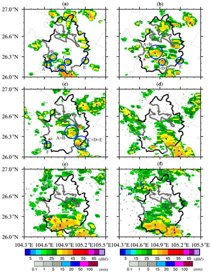 Radar maximum composite reflectivity of three-dimensional mosaic data (shaded, dBZ) overlaid by 1 h accumulated rainfall (colored dots, mm) near Shuicheng County (a) from 09:00 to 10:00 UTC; (b) from 10:00 to 11:00 UTC; (c) from 11:00 to 12:00 UTC; (d) from 12:00 to 13:00 UTC; (e) from 13:00 to 14:00 UTC; (f) from 14:00 to 15:00 UTC on 22 July 2019. The letters in the panels represent the convective cells referenced in the main text.