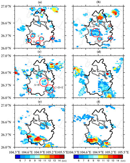 Radar maximum echo-top heights (shaded, km) of three-dimensional mosaic data near Shuicheng County (a) from 09:00 to 10:00 UTC; (b) from 10:00 to 11:00 UTC; (c) from 11:00 to 12:00 UTC; (d) from 12:00 to 13:00 UTC; (e) from 13:00 to 14:00 UTC; (f) from 14:00 to 15:00 UTC on 22 July 2019. The letters in the figure represent the convective cells referenced in the main text.