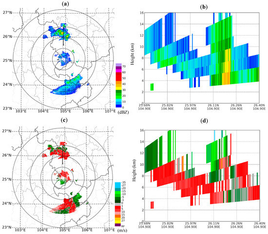 (a) Plan Position Indicator (PPI) reflectivity data and (c) radial velocity data collected by the Xingyi Doppler weather radar at an elevation of 1.5° at 13:40 UTC on 22 July 2019. (b) Range Height Indicator (RHI) reflectivity and (d) radial velocity vertical cross-section along the solid lines in (a,c).