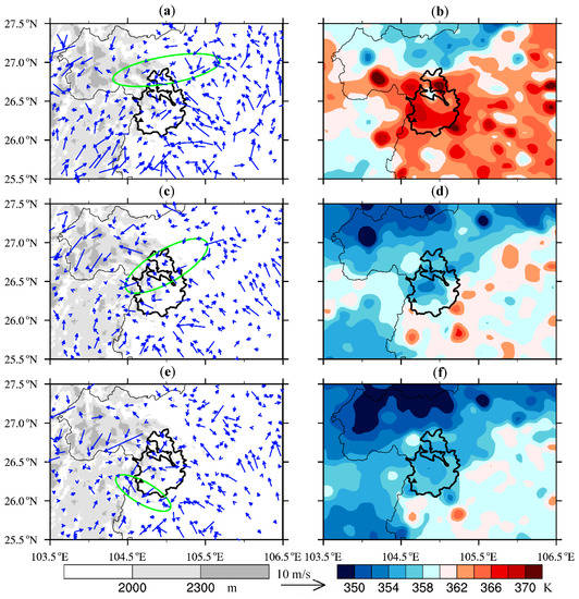 Distributions of the surface winds (blue vectors, units: m/s) and θe (shaded, unit: K, right) observed by automatic weather stations (AWSs) at (a,b) 09:00 UTC; (c,d) 12:00 UTC; (e,f) 13:40 UTC on 22 July 2019. The green circles denote the convergence regions, and shaded areas in the left panel denote the terrain height (units: m).
