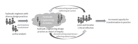 As policy scientists working closely with coastal and river engineers from 2013 onwards, we employed the method of critical reflection (Figure 1), which, through reflection about action, seeks to initiate reflection for action [15,17]. According to Fook [17], critical reflection can free us from restrictive ways of knowing and indicate potential avenues for change. Indeed, Morley [18] claims that critical reflection allows us to research ways to promote congruence between practice-based aims and the ways we actually engage in practice.