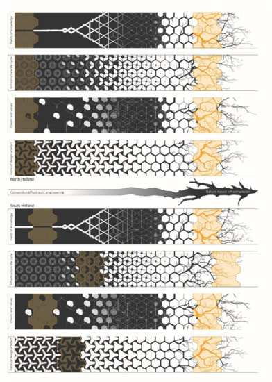Inspecting the representation of the old and the new infrastructures on the four continua in Figure 2 allows us to detect at a glance the shifts, or metamorphoses, from conventional hydraulic engineering (on the left) towards nature-based infrastructures (on the right) that have occurred along the North and South Holland coasts.