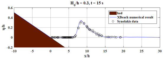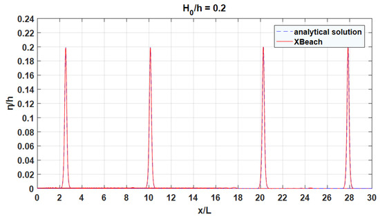 XBeach has been successfully applied to a study large number of coastal engineering problems such as wave-driven dune erosion [22], gravel beach dynamics [23], dynamic coastal flooding [24], to name a few. However, in order for us to gain a better understanding of the performance of XBeach [20] and its resolution requirement, we briefly carry out some common validations for numerical simulation of wave propagation. We note that the vegetation effect, i.e., the term, has been omitted for the time being. As a first check, we simulate the propagation of a solitary wave on a frictionless flat bottom. Figure 1 shows an example of the comparison between the numerical results and the analytical solution of the solitary wave in a dimensionless manner. In this case, the initial wave nonlinearity is , and a fairly dense spatial resolution of 100 grid points per wavelength with Courant number are adopted. As can be seen in the figure, the agreement is still satisfactory after a propagation distance of around 30 wavelengths, which suggests the accuracy of the numerical model.