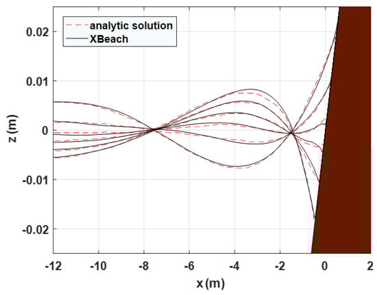 Runup of a liner progress wave on a plane beach with a slope of 1:25: snapshots of free-surface profile at various time stamps. Solid: numerical results by XBeach [20]. Dashed: analytical predictions by Carrier and Greenspan [25]. The incident wave has a period of 10 s and 0.006 m in wave height.