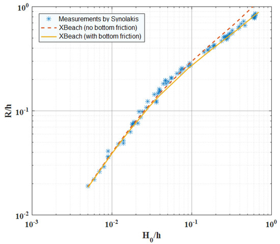 Dimensionless maximum runup height of a solitary wave on a 1:19.85 beach as a function of the initial wave nonlinearity . Symbol: experimental data by Synolakis [26]. Dashed: numerical results by XBeach [20] with zero bottom friction. Solid: XBeach results with additional bottom friction using a Chézy coefficient .