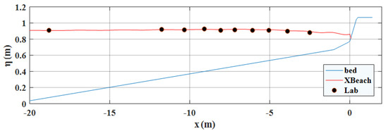 Free-surface profile of a random wave generated with JONSWAP spectrum propagating on a composite beach. Symbol: laboratory data by Løvås and Tørum [27]. Line: numerical results by XBeach [20]. In this case, the peak frequency of the incident wave is 2.5 s, the significant wave height is 0.14 m, and the constant depth is 0.77 m. The part of the composite beach shown here has a slope of 1:30, 1:10, and 1:1.5 (from left to right).