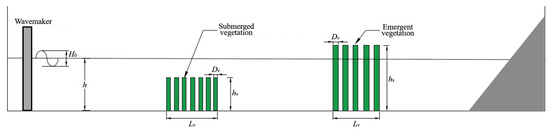 Typical experimental setup for the laboratory study on wave through a vegetated water with either submerged or emergent vegetation. : initial wave height; h: constant water depth; : vegetation steam height; : stem diameter; : width of the vegetated bed. A typical wave absorbing beach is usually installed at the end of the wave tank.